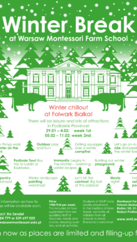 Warsaw Montessori Family invites children  (age: 6-14) to its Sleep-over Winter Camps at Montessori Farm School “Folwark Białka”, just 150 kilometres east of Warsaw.  Our Camp Weeks are held in English and run – from January 29 – February 4 – (1st week) – and February 5 – 11 – (2nd week). As well as plenty […]
